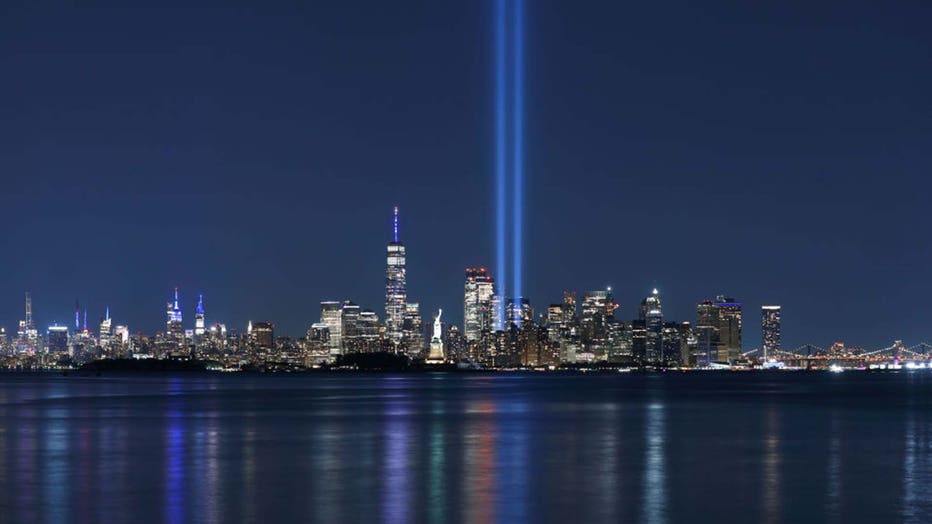 FILE - The annual Tribute in Light is illuminated behind the Statue of Liberty and next to One World Trade Center in New York City on the 20th anniversary of the 9/11 attacks on Sept. 11, 2021 as seen from Jersey City, New Jersey.