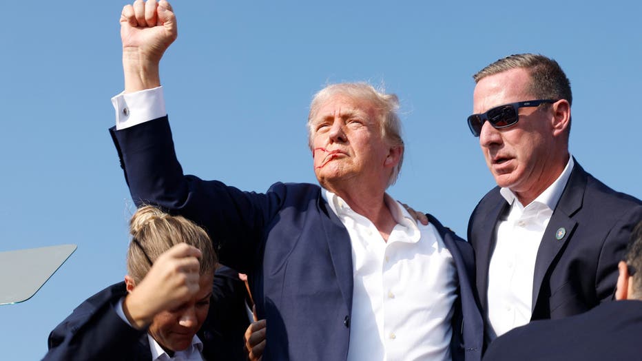 BUTLER, PENNSYLVANIA - JULY 13: Republican presidential candidate former President Donald Trump is rushed offstage during a rally on July 13, 2024 in Butler, Pennsylvania. Butler County district attorney Richard Goldinger said the shooter is dead aft