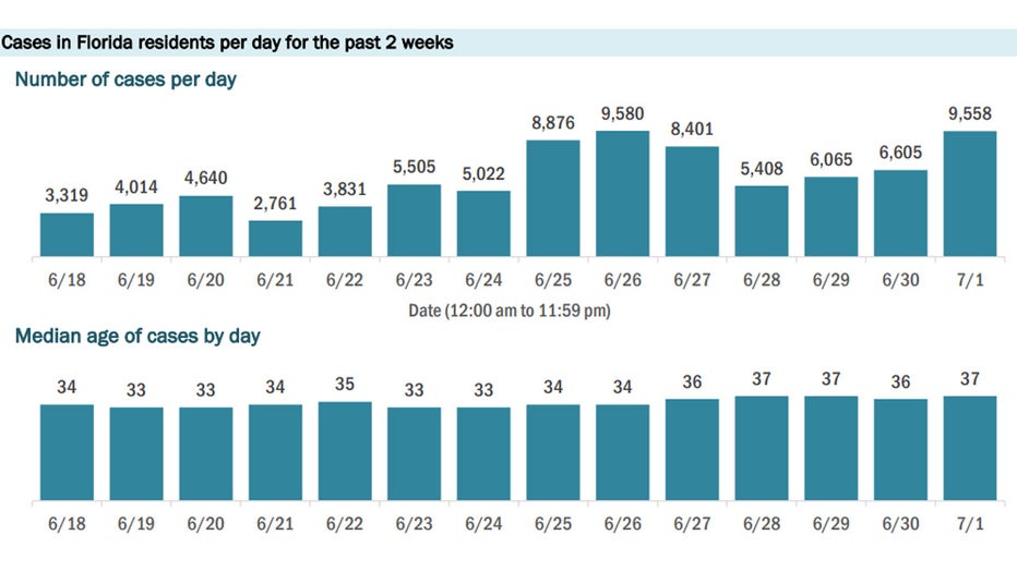 Gov. Ron DeSantis says the recent case increases are largely due to testing of "high-risk" individuals like farmworkers in the state's rural counties, prisoners, and residents of long-term care facilities, though he has also noted the "erosion" in social distancing, especially among the younger demographics in social setting. That prompted him to order all bars to cease serving alcohol Friday.
