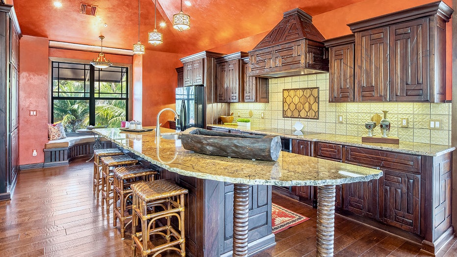 There are three bedrooms and three bathrooms and the kitchen has custom mahogany cabinets and high-end appliances, according to the property description.