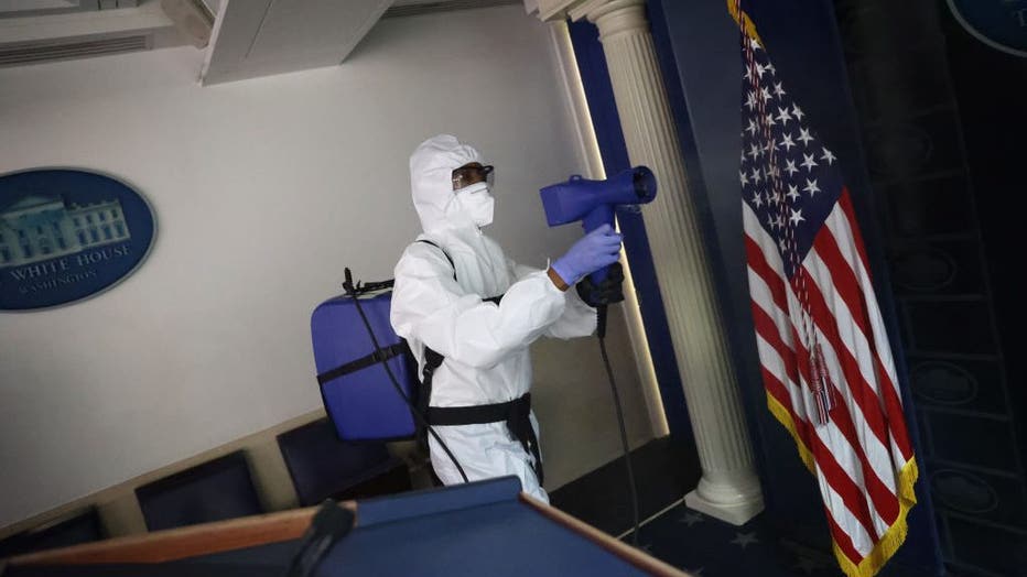 A member of the White House cleaning staff sanitizes the James S. Brady Press Briefing Room on Oct. 05, 2020, in Washington, DC. (Photo by Win McNamee/Getty Images)