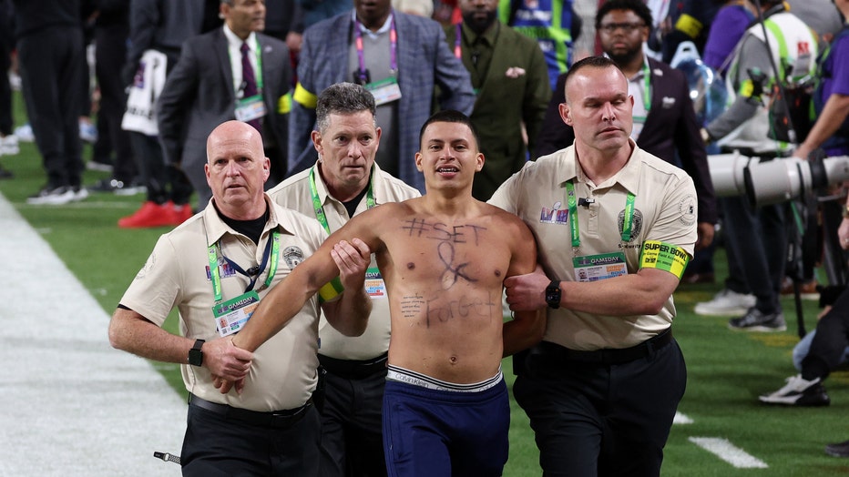LAS VEGAS, NEVADA - FEBRUARY 11: A fan is escorted away after running onto the field in the third quarter during Super Bowl LVIII between the San Francisco 49ers and Kansas City Chiefs at Allegiant Stadium on February 11, 2024 in Las Vegas, Nevada. (