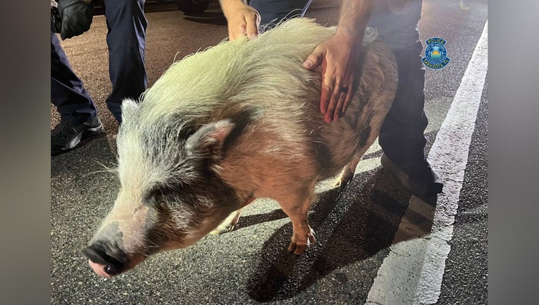 The pot-bellied pig is mostly white with black spots and pink markings, and officers said it weighed about 100 pounds.