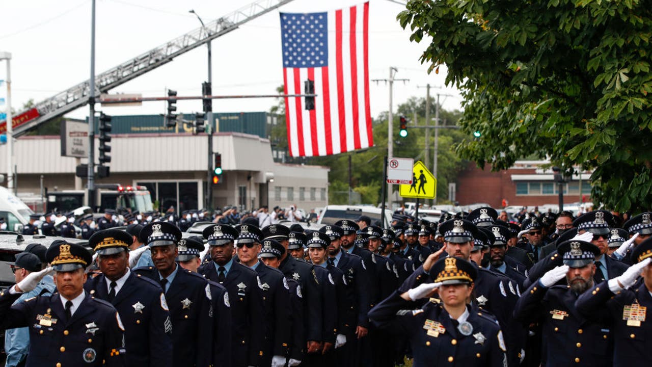 CHICAGO, IL - AUGUST 19: Chicago Police officers salute as they attend the funeral for Chicago Police Officer Ella French on August 19, 2021 in Chicago, Illinois. 29-year-old Officer French was shot and killed while conducting a traffic stop on Augus