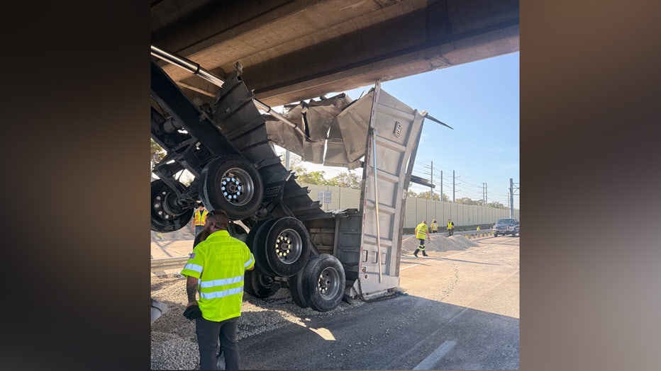 Trooper Ken Watson with the Florida Highway Patrol said that the 43-year-old dump truck driver, who does not speak English, was driving from Miami and had a button engaged to lift his load. Troopers said the driver is a legal citizen. Watson added that it's possible the button was engaged all the way from Miami.