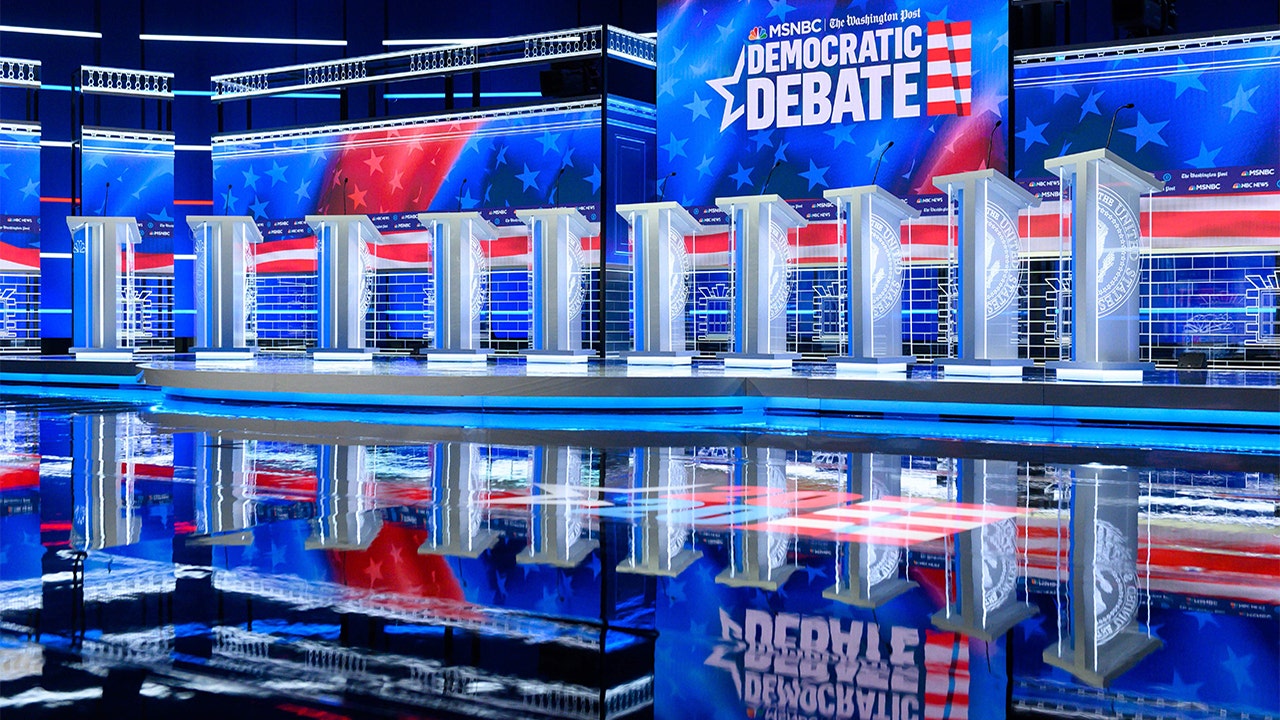 The debate stage is prepared for the upcoming Democratic Presidential Debate hosted by MSNBC and The Washington Post at Tyler Perry Studios in Atlanta, Georgia, on November 19, 2019. The debate is scheduled for November 20. (Photo by SAUL LOEB/AFP vi