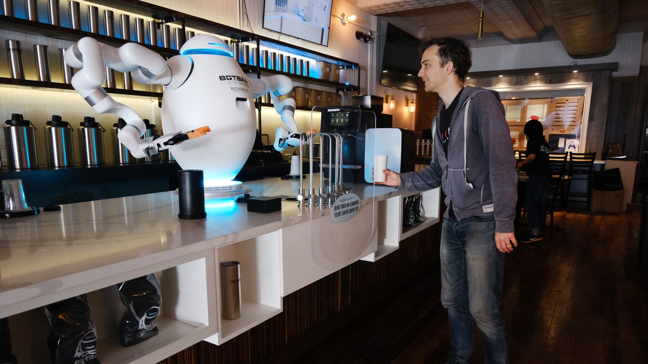 A two-armed robot called "ADAM" prepares a cup of coffee for a customer at Botbar coffee shop on May 31, 2023 in the Brooklyn borough of New York City. (Photo by Spencer Platt/Getty Images)