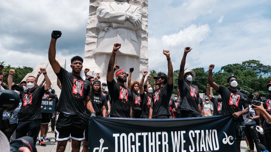 Members of the Washington Wizards and Washington Mystics basketball teams rally at the MLK Memorial to support Black Lives Matter and to mark the liberation of slavery on June 19, 2020 in Washington, D.C. (Photo by Michael A. McCoy/Getty Images)
