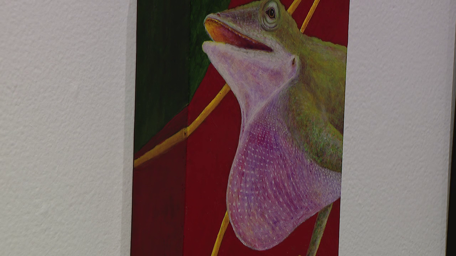 Husband and wife Art Venti and Jen Fox-Venti both have artwork in the show, but their pieces vastly differ. Art Venti created a surreal color-pencil piece, a much smaller-represented piece compared to his larger work. Jen Fox-Venti combined her two passions, art and animals, to paint a lizard.