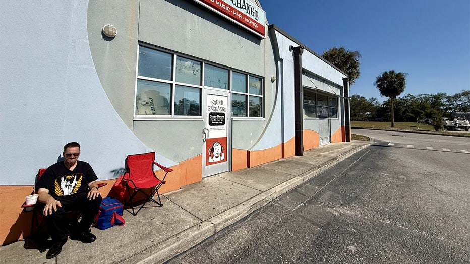 Outside Sound Exchange in the University area of northern Tampa, William Rausch camped out in a lawn chair. He’ll be there all night long in order to be first in line tomorrow.