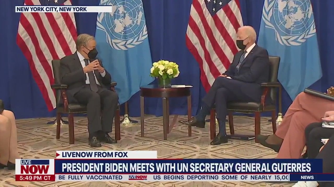 Biden met Monday evening with U.N. Secretary-General Antonio Guterres. In brief remarks at the start of their meeting, Biden praised the international body for never being "short on ambition."