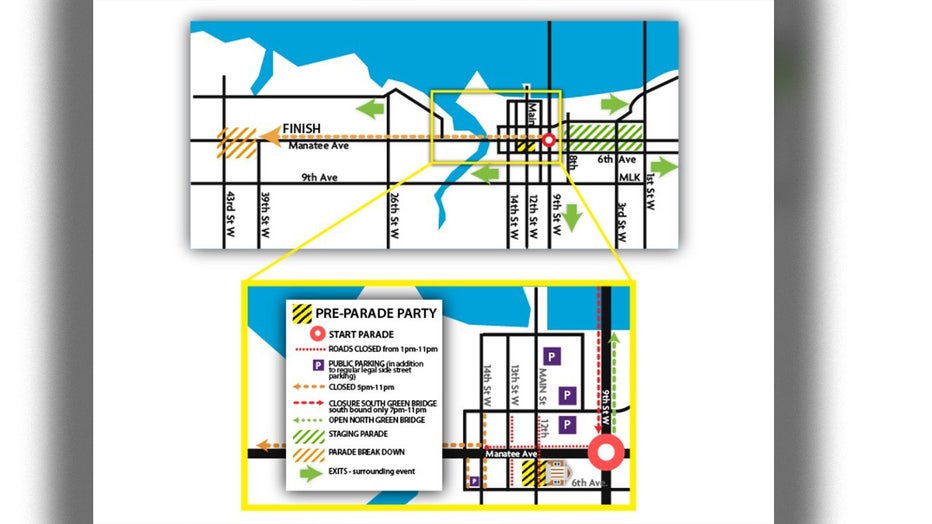 This nine-block section of Manatee Avenue will close at 12 p.m. on parade day with westbound Manatee Avenue traffic re-routed around the parade staging area via 9th Avenue West. Eastbound traffic will not be affected.