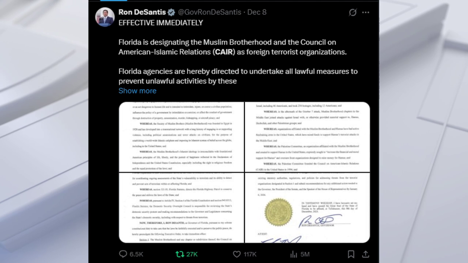 Last week, DeSantis announced he was officially designating the Council on American Islamic Relations (CAIR) as a foreign terrorist organization and directing Florida agencies to "undertake all lawful measures to prevent unlawful activities by the group, including denying privileges or resources."