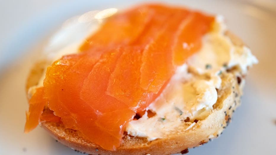 Close-up shot of a salmon lox and cream cheese bagel on a plate in Lafayette, California, December 13, 2020. (Photo by Smith Collection/Gado/Getty Images)