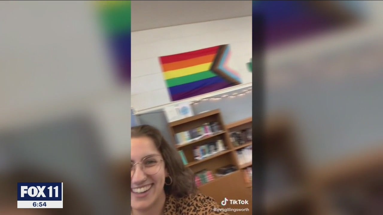 ORANGE COUNTY, Calif. - A California school district is investigating a teacher after she posted a video admitting that she encouraged her students to pledge allegiance to a gay pride flag after she removed the American flag from her classroom.