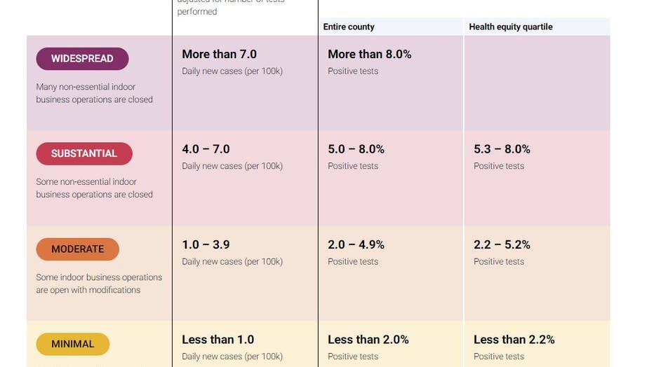California divides its counties into four color-coded tiers based on the spread of the coronavirus. The red tier is the second-highest risk level.