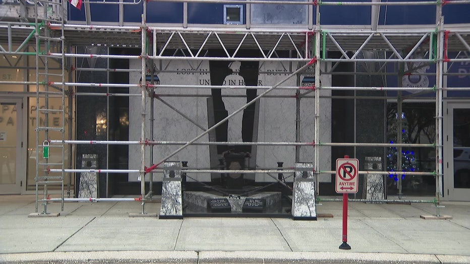 Scaffolding surrounds the front exterior of the building, as many maintenance concerns continue.
