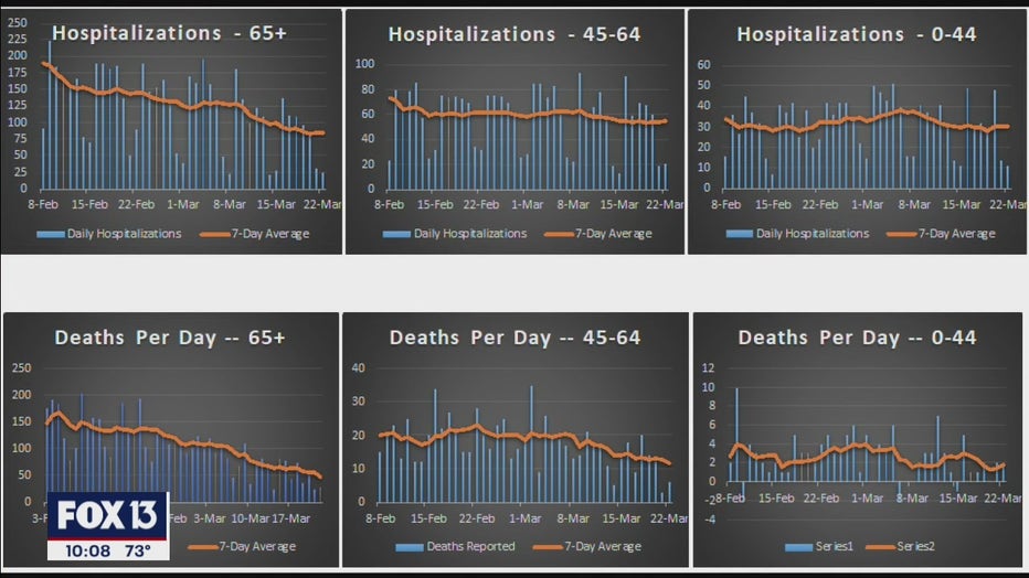 TAMPA, Fla. - Recent data from the Florida Department of Health shows the seven-day rolling average of hospitalizations for people 65 and older in Florida is 100 fewer now compared to the beginning of February.
