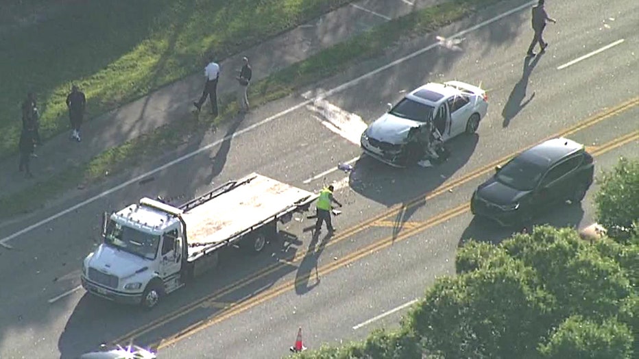 The view from SkyFOX shows traffic is significantly backed up near Twin Lakes Boulevard in the Greater Carrollwood area where the crash scene is located. A FedEx vehicle is seen resting on its side in the westbound lanes.