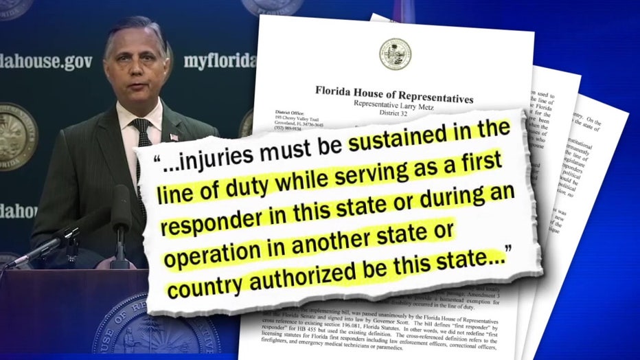Former Representative Larry Metz added language in the bill stating injuries had to occur while serving in Florida or in an operation authorized by this state. In 2018, Metz sent FOX 13 a letter stating it’s a policy judgment that Florida homeowners should not have to pay higher taxes to subsidize first responders who worked out-of-state before moving to Florida.