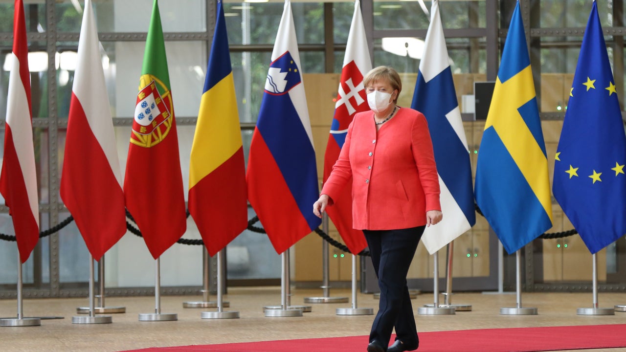 FILE - German Chancellor Angela Merkel arrives for an EU Summit on July 17, 2020 in Brussels, Belgium. (Photo by Pool/Getty Images)