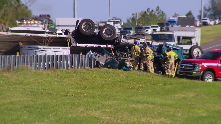 Upon impact, investigators said the semi-truck was redirected across all southbound lanes of travel, overturned onto its right side and came to a stop partially in the grass median and across all three southbound lanes of I-75.