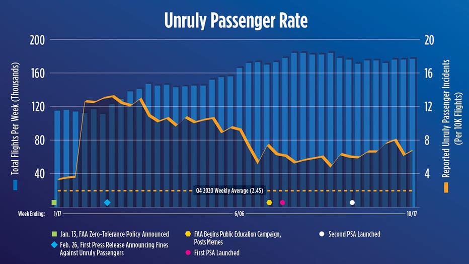 The FAA is reporting that there is less unruly passengers in recent weeks compared to the start of the summer. There were about 6.7 reported incidents per 10,000 flights for the week ending Oct. 17, according to the agency's latest figures. This is down slightly from late September when there were approximately 7.1 reported incidents per week.