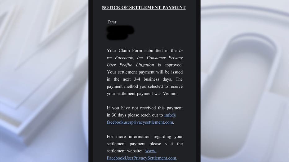 Screenshot of the notice of settlement emailed to Facebook users. (Credit: FOX 5 NY)