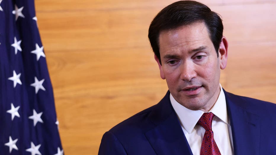 US Secretary of State Marco Rubio speaks to reporters in a departure lounge before returning to Washington following meetings with Caribbean Community (CARICOM) leaders, at Robert L. Bradshaw International Airport in Basseterre, Saint Kitts and Nevis