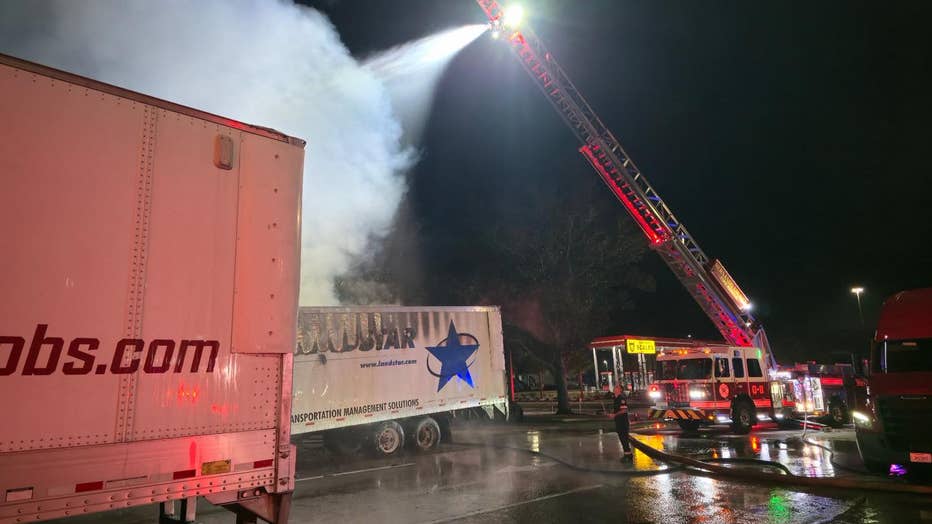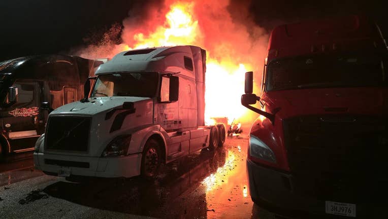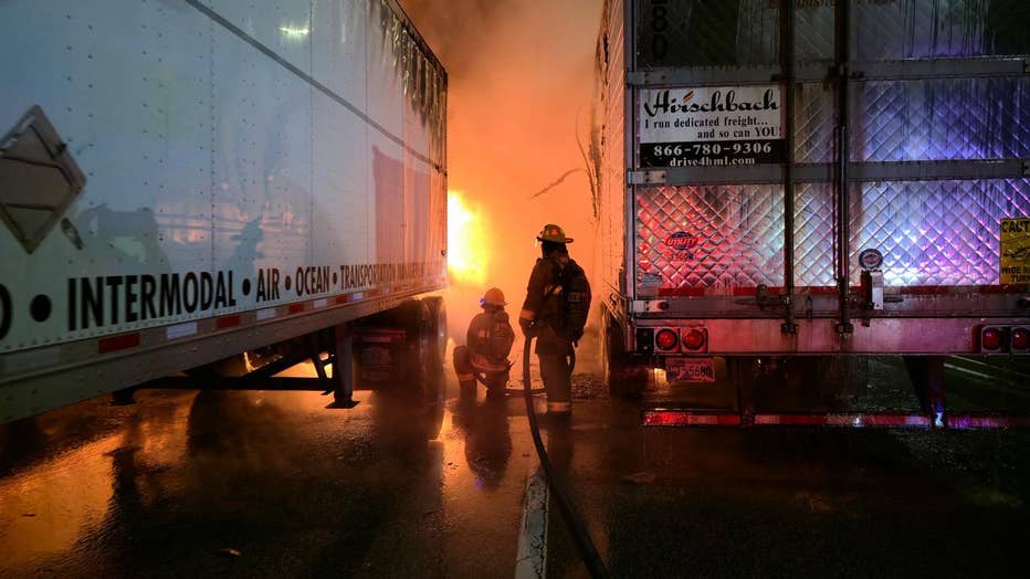 Two semi-truck trailers were completely destroyed, with a third sustaining fire damage.