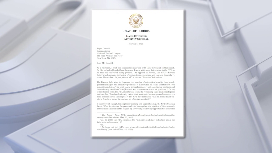 "The NFL’s use of the Rooney Rule violates Florida law by requiring race-based considerations in hiring. Florida law is clear. Hiring decisions cannot be based on race," said Attorney General Uthmeier.