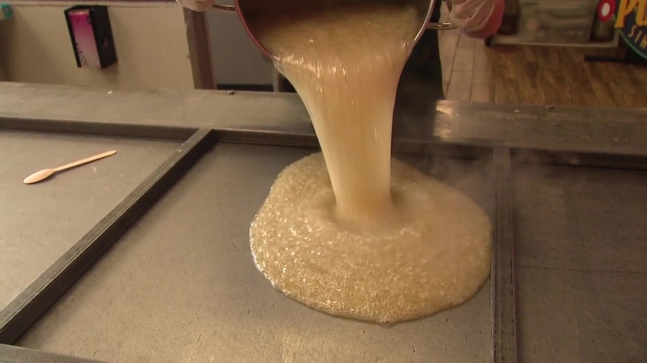 Meanwhile, Uri Gottschalk, the candy cane maker, added, "We’re left with basically liquid sugar. From that point, we pour it out on our antique cooling table… just the tiniest drop of purple to make it pop."