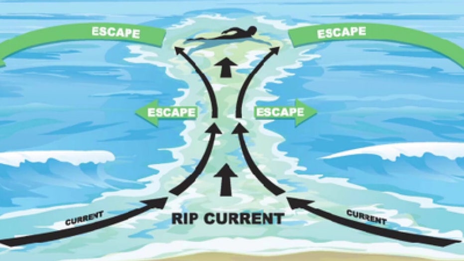 "Just go with the flow," Chief Barrs said. "Float on your back. If you can, paddle or swim parallel to the beach. There's no way you'll be able to swim against the current and not become fatigued. That's where we see a lot of folks get overwhelmed and fatigued and unfortunately, drown. So, if you get caught, just try to drift with it and gently paddle yourself parallel to the beach until you get out of the rip, and then you can swim back to shore. You can signal and waive and let people know you're in trouble, get 911 on the way, but don't try to fight the rip," he said.