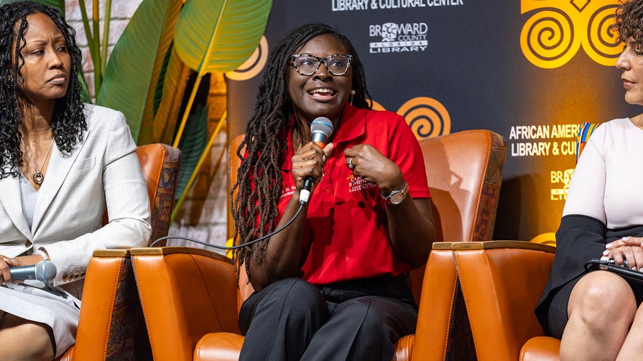 Coral Springs Commissioner Nancy Metayer Bowen, center, speaks as ACLU of Florida Executive Director Bacardi L. Jackson, right, and President, Broward County Black Chamber of Commerce Shaheewa Jarrett Gelin, Esq., left, listen during the "Out of Many