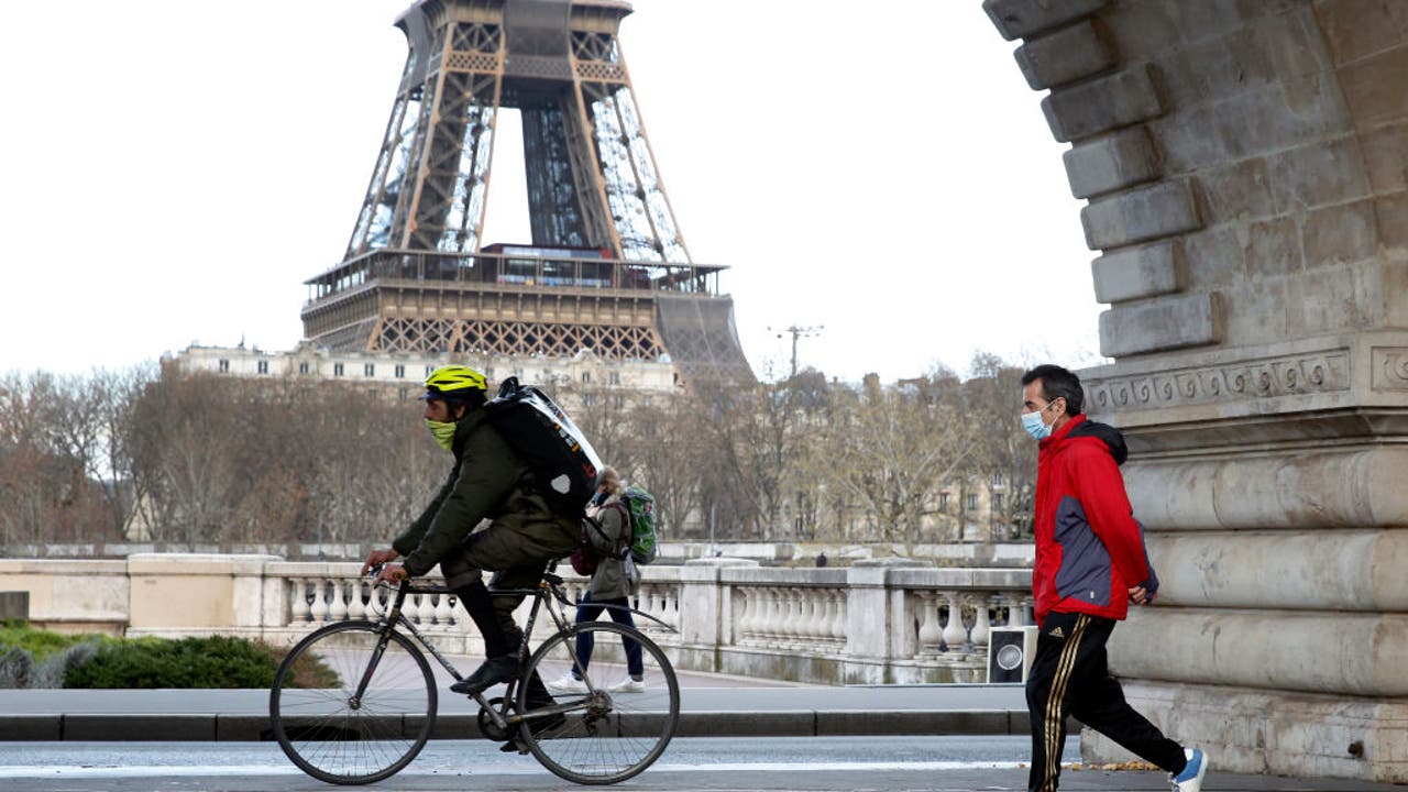 A man wearing a protective face mask and a cyclist pass near the Eiffel Tower before the curfew, which begins at 6 p.m, during the coronavirus disease (COVID-19) outbreak on March 15, 2021 in Paris, France.