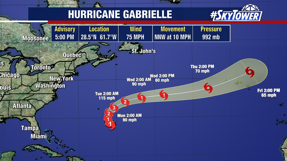 Gabrielle will not bring any direct impacts to the United States and should pass east of Bermuda, though the island should still monitor it for fringe impacts.