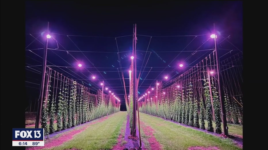 Most hops are grown in the Pacific Northwest. For hops to grow well, they need more daylight than what we experience here. So UF researchers attached LED lights that turn on at night to the top of their growing poles to imitate daylight.