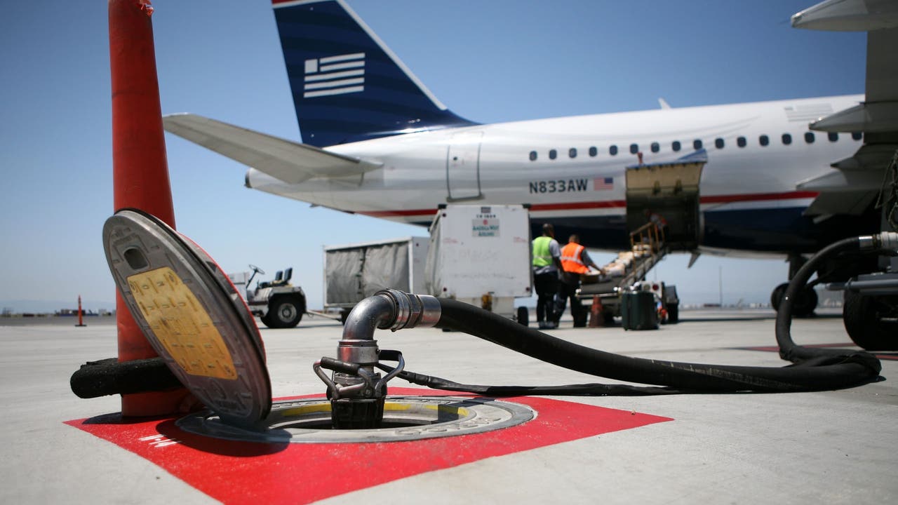 A fuel line is connected to an underground tank near a parked U.S. Airways plane at the Oakland International Airport July 18, 2008 in Oakland, California. (Photo by Justin Sullivan/Getty Images)