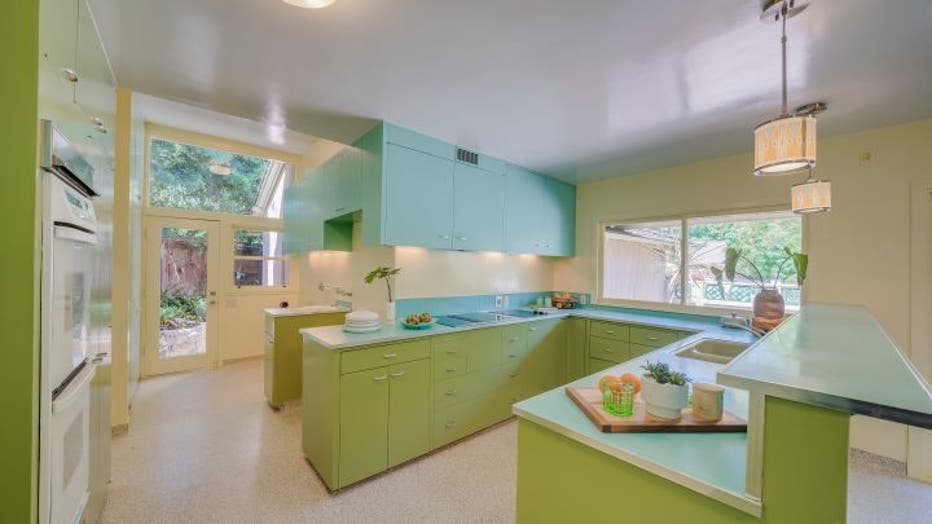 The kitchen still includes its original Formica and a turquoise, avocado and yellow-accent motif.