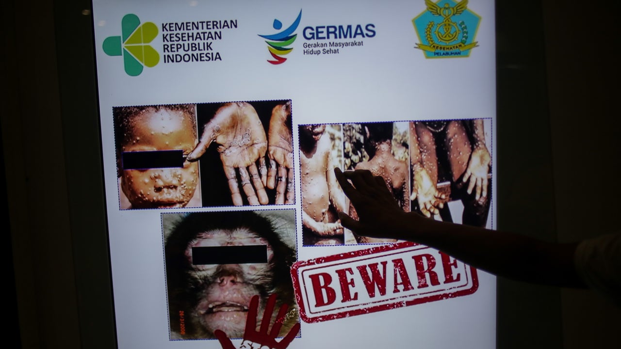 TANGERANG, INDONESIA - MAY 15: A passenger walk in front of a monkeypox virus information at Soekarno-Hatta International Airport in Tangerang near Jakarta, Indonesia on May 15, 2019. Monkeypox is an infectious disease by monkeypox virus endemic from