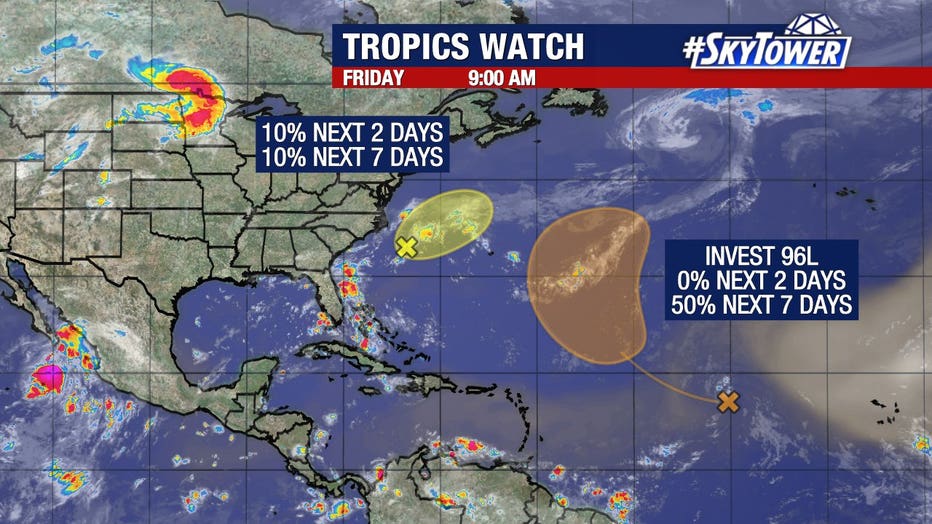 The NHC is giving Invest 96L a 50% chance of development in the next seven days. It's expected to move west-northwest across the central Atlantic.