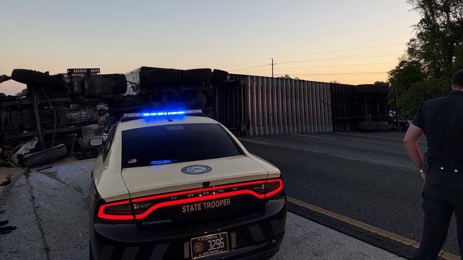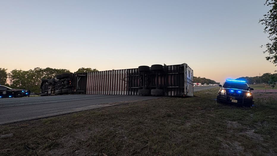 OXFORD, Fla. - The driver of a tractor-trailer overturned on northbound I-75 in Sumter County on Wednesday morning, forcing the interstate to shut down.