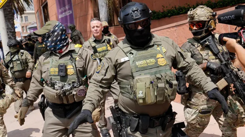 Gregory Bovino, chief patrol agent of the El Centro Sector and commander of Operation At Large CA, marches with federal agents toward the Edward R. Roybal Federal Building in Los Angeles on Aug. 14, 2025. (Carlin Stiehl/Los Angeles Times via Getty Im