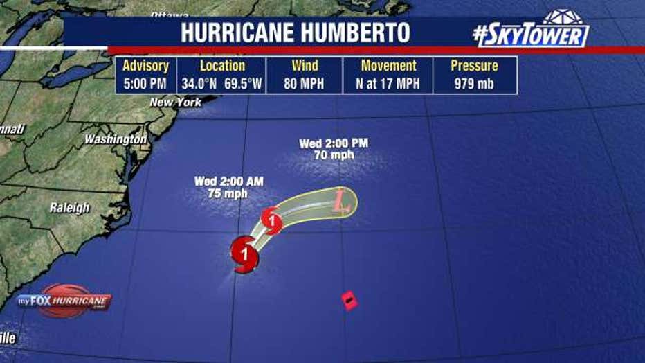 As of 5 p.m. on Tuesday, Humberto is located 34.0°N and 69.5°W.