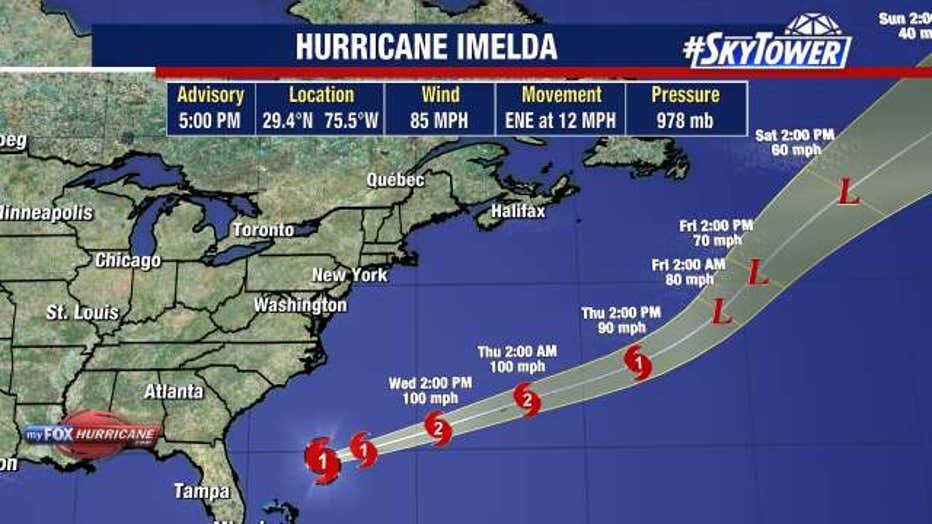As of 5 p.m.. on Tuesday, Hurricane Imelda was located at 29.4°N 75.5°W.