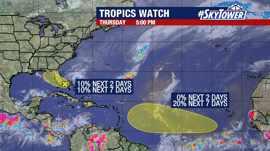 There are two areas of interest in the tropics, including a weak area of low pressure off the southeast coast of Florida.