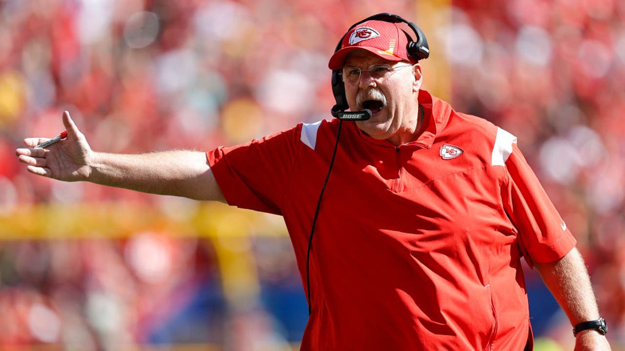 KANSAS CITY, MISSOURI - SEPTEMBER 26: Head coach Andy Reid of the Kansas City Chiefs on the sidelines in the game against the Los Angeles Chargers at Arrowhead Stadium on September 26, 2021 in Kansas City, Missouri. (Photo by David Eulitt/Getty Image