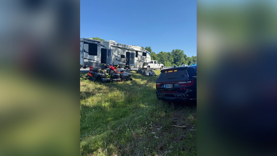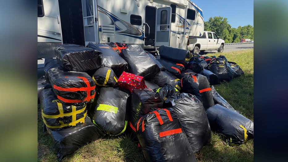Several other troopers arrived at the scene, and claimed they found stacks of black plastic trash bags labeled with duct tape. They said 15 large bags of marijuana were removed from the front portion of the RV. The camper’s interior, according to troopers, was modified to conceal and transport drugs, where nearly 50 bags were removed.