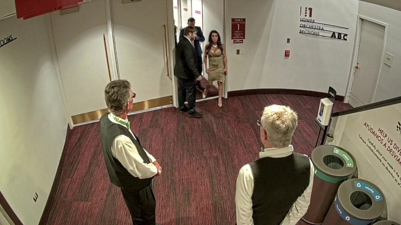 Security footage released to Storyful on Wednesday by Denver Arts & Venues, an agency of the City and County of Denver, shows Rep. Boebert and another person being led out of the venue by theatre staff.