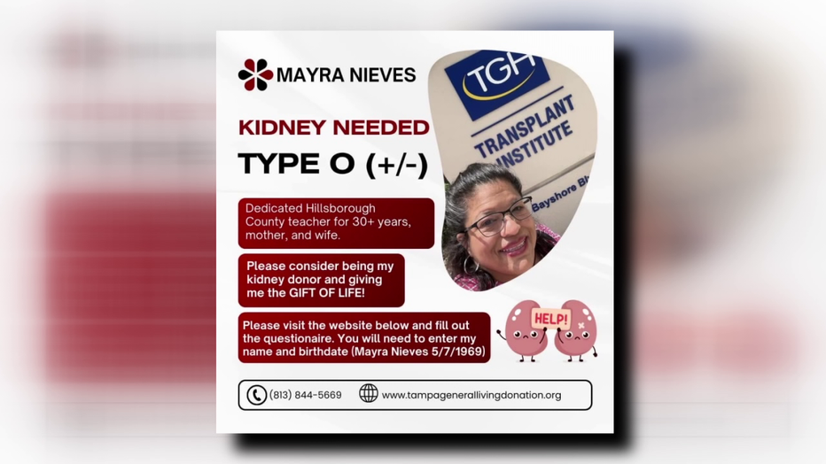 Mayra Nieves, a teacher at Pinecrest Elementary School in Lithia, spent nearly four years on dialysis while waiting for a kidney transplant after doctors diagnosed her with an immune disorder in 2018 that led to kidney failure.
